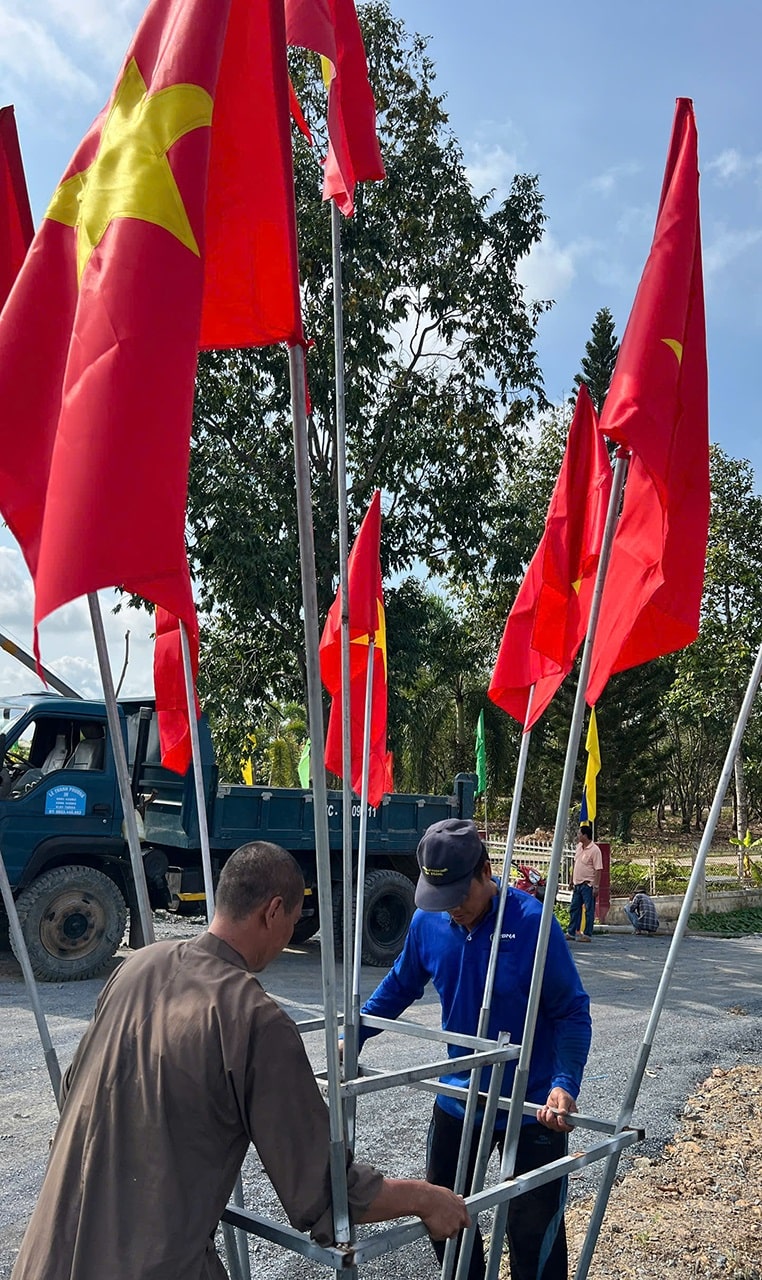 Song song đó, các tấm băng rôn và tâm thư dành cho buổi lễ cũng đang được hoàn thiện. Từng mũi bắn đinh, từng mối hàn được mọi người chăm chút tỉ mỉ, gửi gắm vào đó bao kỳ vọng và niềm tin.