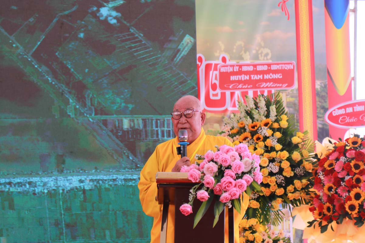 Phát biểu tại buổi lễ, TT. Thích Phước Huệ bày tỏ lòng tri ân đến sự đồng hành của chư Tôn đức, quý mạnh thường quân, Phật tử gần xa cùng chính quyền các cấp, đồng thời long trọng tuyên bố khai mạc lễ khởi công.